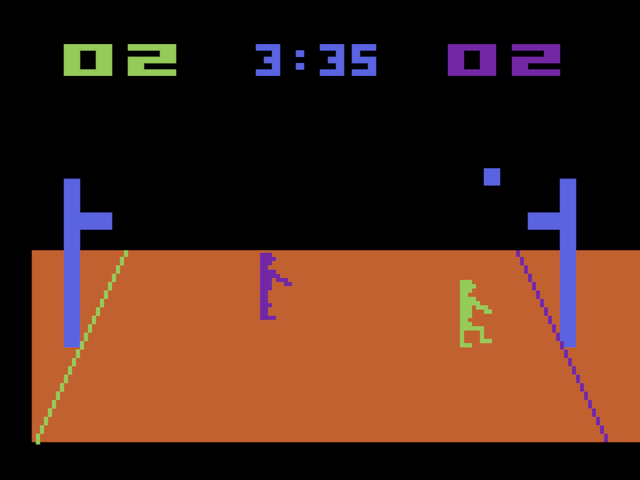 One game that really surprised me with how good it is is Basketball for the Atari VCS. I don’t normally like competitive sports games, and this game doesn’t really innovate on the idea of two people playing basketball at all, but it is just done so right! There is something so vicious and tense about the feel of the game that makes it very satisfying to play! You can use the only button on your Atari controller to throw the ball or try to catch the ball you opponent throws, but you steal the ball from your opponent just by lining up your feet with his, rather than using the button. I imagine games with the computer would get old too quickly if you played this game a lot, but there’s also an option to play with a friend.