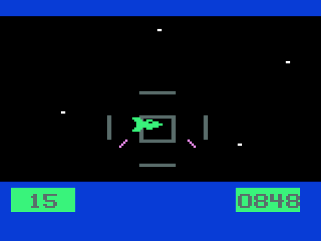I did find one decent game for the Odyssey² this year – Cosmic Conflict, a 3d, first-person space shooter! The goal is to destroy 15 ships before your fuel runs out, with your “score” basically being how much fuel you manage to have left by the time you do this. Time uses up fuel, but so does firing a shot, so you want to try and miss as little as possible. There’s a lag between when a shot is fired and when it hits the target, so you need to time your shots properly by observing the movement of the ships. Some enemy ships will come at you and try to hurt you. You want to try and blast these before they can reach you or they’ll take a lot of fuel. If you don’t think you can make it, you can turn far away from them to escape. I liked it because it’s cool to see a 3D console game this early, and because of the complexity of trying to figure out how to maximize your remaining fuel by the end of a run. I think the ambient sound effects are well done and do a good job at portraying the eerie, quiet, ominous emptiness of outer space.