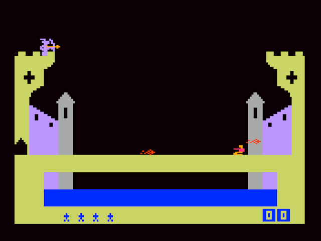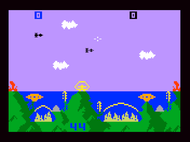 Atlantis for the Intellivision and Atari 2600 (with a port in 1983 for the Odyssey²) combines elements from multiple arcade games into one for an interesting challenge. I personally didn’t care much for it because the concept behind it is just so incredibly dark and depressing without all the cuteness of the last two games, but it was apparently quite popular at the time, so I felt like I had to include it anyway. In Atlantis, you get to see what happened to the lost civilization from the perspective of a person fighting a hopeless battle to defend it from invaders. You need to destroy the enemy aircrafts as they appear on the screen before they have a chance to ruin any of the pretty city! As the game progresses, it gets harder and harder to stop them until all the parts of the poor city are gone, and everyone is dead, and the game ends. 😢