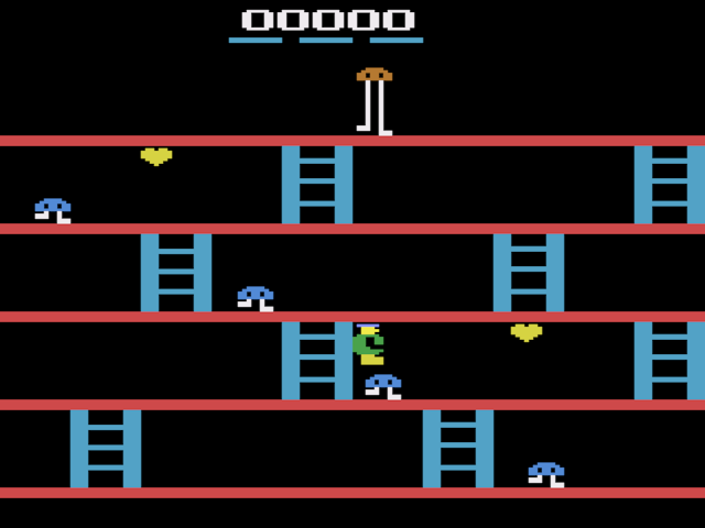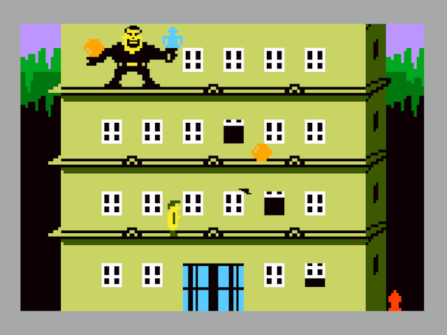 Another example of a game similar to Donkey Kong but with its own creative spin is Beauty and the Beast, which has no relation at all to the famous fairy tale. The game is at least relatively more similar to Donkey Kong than Fast Eddie is. Instead of Donkey Kong, you have “Horrible Hank”, who throws rolling boulders instead of barrels. Horrible Hank has kidnapped a woman named “Tiny Mabel”, and it’s up to her boyfriend, Bashful Buford, to save the day. Just like with Donkey Kong, your mission is to reach the top of the screen, and when you approach Horrible Hank, he gets away with Mabel and you are on to the next screen, climbing a tower. But there are still differences from Donkey Kong that keep the game interesting! Instead of Climbing ladders for example, you climb windows that open and close similar to the arcade game Crazy Climber. While you try to time yourself to be able to climb the windows, you have to watch out for unique and interesting enemies – birds and rats and bats – that try to stop you! Maybe it could have done more to differentiate itself but I thought it was fun and worthwhile as it is. 🤷🏻♀️