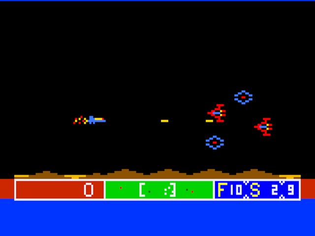 Like with previous years, we also have more straight clones and ports of arcade games. Cosmic Raider for the Astrocade is such a game, based as it is on an arcade game from 1981 called Defender. As with defender, the goal is to use your radar to track down enemies and eliminate them, though unlike Defender, there are no people to rescue during the missions. Instead, you are trying to stop missiles from reaching the ground. I actually like the Astrocade version better than the original because of its easier control scheme for changing the direction of your ship, because of its configurable difficulty, and because stopping missiles is a lot less tedious and frustrating than rescuing the people. The graphics are inferior to the original Defender but in my opinion they still look quite nice for the time! I was happy to see that the Astrocade still has a title worth playing at this point.