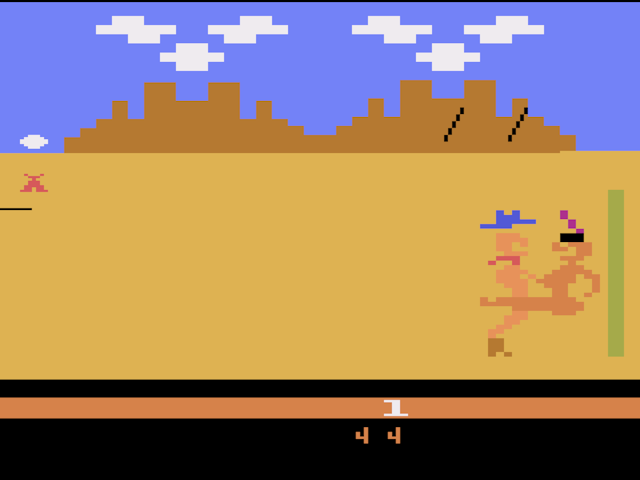 Another fascinating train wreck of the time to gawk at is Custer’s Revenge for the Atari 2600, brought to us by a porn-themed video game company called PlayAround. If E.T. the Extra Terrestrial is the worst video game ever produced, Custer’s Revenge is quite possibly the most tasteless and offensive. Now I realize that the competition is pretty stiff there! But I’m telling you – none of the contenders are anywhere near as “stiff” as General George Armstrong Custer, an actual historical figure who is out to get revenge for his defeat at the hands of Native Americans in the 1876 Battle of Little Bighorn. He does this by coming back to life and copulating with a Native American woman tied to a pole, presumably to contaminate their gene pool with his White genetics as the rest of the tribe desperately tries to stop him. At least the woman doesn’t seem to mind it too much.