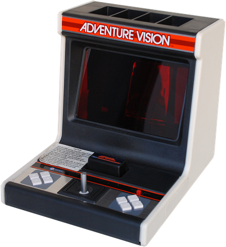 The last console of any kind to talk about is the Entex Adventure Vision released in the later half of the year. Like the Vectrex, the Adventure Vision has its own built-in screen. It’s a portable console – or at least, semiportable. It’s much too big to go in your pocket, but is still much smaller than a full console. It’s designed to be quickly moved from tabletop to tabletop and could run on battery power for a short time before needing to be plugged in again – a bit like a laptop, only with no folding. Sadly even that limited level of portability required huge compromises in system specs. The console’s flickery graphics are monochrome, only being able to show pixels as on (solid red) or off (solid black), with no in-between coloring possible. The 150×40 screen resolution is terrible, and the overall graphical presentation is so limited that it’s almost impossible to tell what you’re doing! Only 4 games were released for this poor little thing, all of which came out the same year. All 4 are just severely downscaled ports of arcade games and don’t offer anything in the way of unique features or gameplay compared to the originals. The Adventure Vision was certainly an interesting idea and I do admire them for braving the odds and giving it a go. But in the end, 1982 was just not the year of portable gaming consoles – the tech just wasn’t there yet. 😕 Dare to dream little guy! 🫡