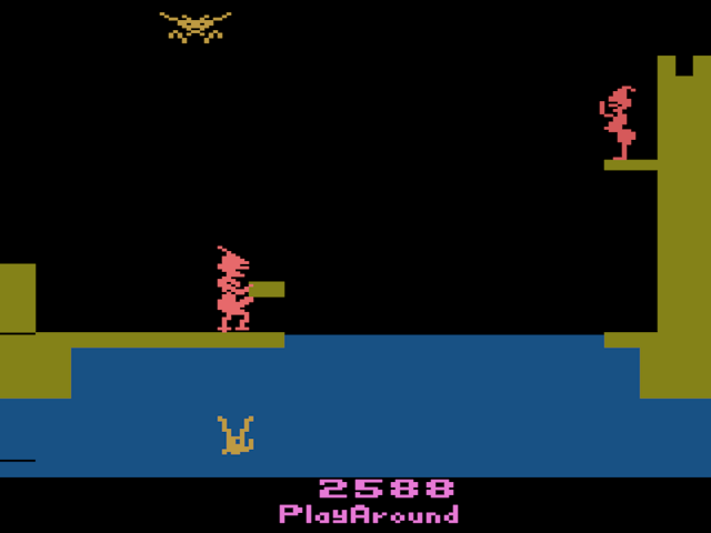 Most of PlayAround’s games were nearly as awful, but one I thought was actually quite clever, funny, and overall very well done for what it is is Knight on the Town, also for the Atari 2600. In this game, you are a brave and noble knight who, as the manual puts it, “is NOT in shining armor”. There is a rather curvaceous… er… I mean “fair” maiden who is very interested in what she can plainly see you have to offer. The problem is that she’s trapped in a castle across a moat of water! So you are building a bridge in order to reach her by picking up blocks from a stack and placing them down over the water. There to make things difficult for you are several monsters, most notably a hungry crocodile that will bite your peenie off in an elaborate animation if you fall into the water! You have infinite lives, so with enough patience you will always be able to eventually reach the girl in the castle no matter how bad you are at video games. But while you have a lot of feelings running through you at the moment, patience is not one of them, so your goal is to get to her in the best time possible! The developer does an especially good job with the animations of the knight, making him move and bounce in just the right way to create an extremely lewd display even under such extreme graphical constraints. At the very least, I can say it was certainly one of the more interesting and memorable things I’ve encountered with this whole gaming project!