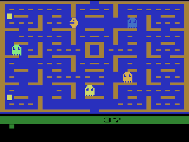 So if Atari had the exclusive rights to make a console port of Pac-Man, what did they do with those rights other than sue people? Produce garbage! Atari’s Pac-Man for the Atari 2600 is infamous for being a deeply flawed and limited port of Pac-Man. The ghosts have no AI and just move randomly around the maze. The game deals with the limitations to on-screen sprites per frame by having all four ghosts flicker badly so that each frame has only one ghost visible. This makes it hard to tell where the ghosts actually are in the maze, makes the game look really ugly, and made getting a screenshot for this article a serious pain. 😩 Other than the ghosts and Pac-Man himself, all graphics are just featureless rectangles with identical coloring. Critics also loathed the unfaithfully blue background, which was the result of a strange policy by Atari at the time that no game could have a black background unless the game took place in outer space.