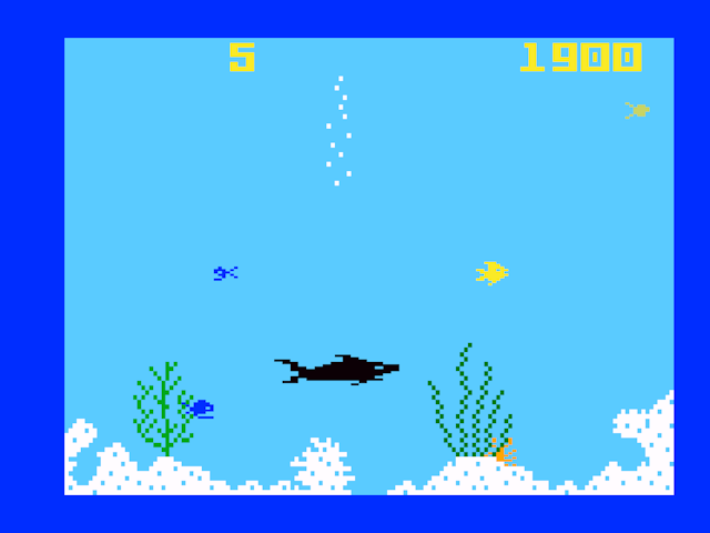 Another game that manages to be super cute in spite of the dark predatory concept is Shark! Shark! for the Intellivision. In Shark! Shark!, you play a little fishy who wants to grow up to be not so little anymore! To do that, you have to go around eating smaller fish by running into them. But be careful! If the fish you run into is bigger than you, you’ll be the one who gets eaten instead! Adding to the fun is a big and scary shark that dominates the festivities. If he gets ahold of you, you are done for, though if you are feeling particularly bold, you can get nips off of his tail!